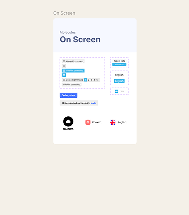 The nature of this voice driven experience required a “say what you see” approach, with voice commands that needed to be short and tested to evaluate recognition. We had to be strategic about the realstate of the screen, optimising the amount of elements and focusing main actions at the center and supplemental navigation on the bottom left corner, hiding away after a few seconds to be as unobtrusive as possible.
