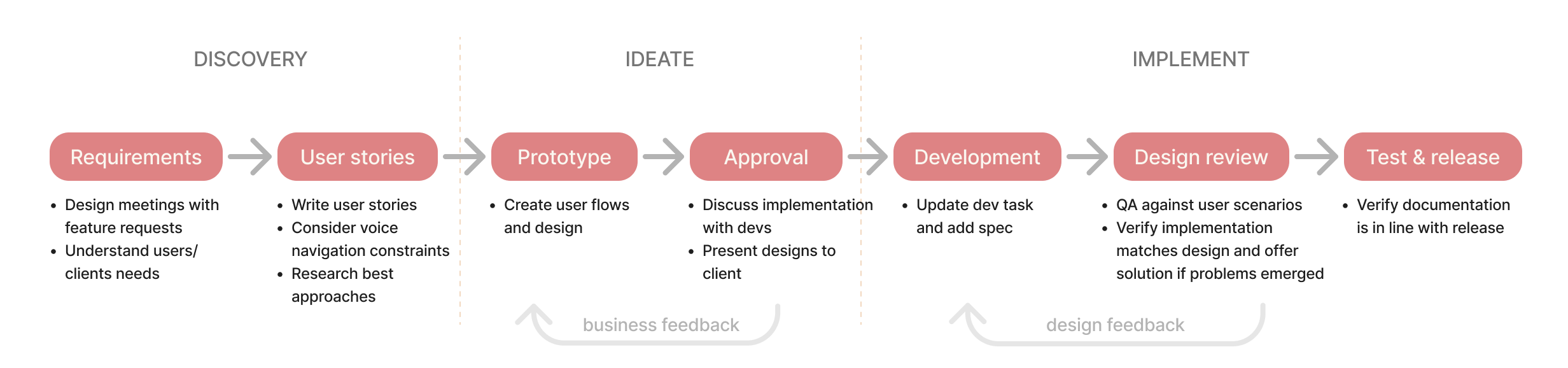 Our team used the Agile methodology. As the lead designer, at the start of this project, I defined how the design processes would integrate with development and testing withing the sprints.